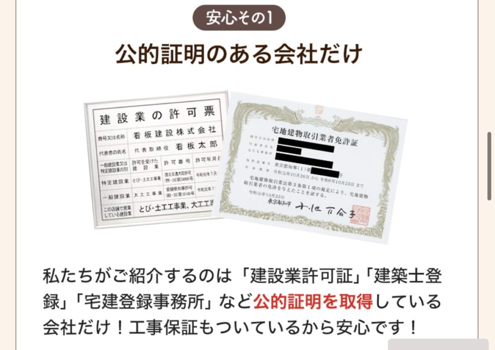 建設業許可証など公的証明を取得済みの工務店だけを紹介しているのが最大の特徴です。