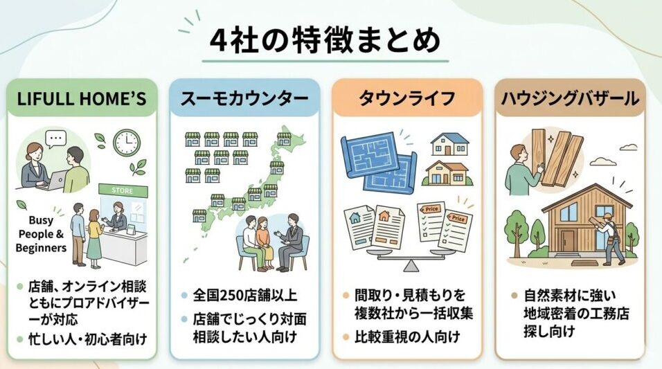 大手メーカーと工務店をバランスよく見たい場合はタウンライフ、地元工務店に視野を広げたいならハウジングバザールを選びましょう。