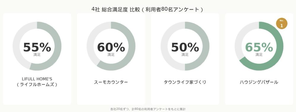 満足度でもハウジングバザールが4社中トップ(65%)で、自然素材に特化したサービスならではの強みが出ています。