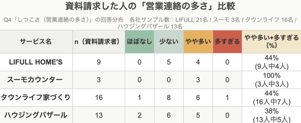 ※スーモカウンター(n=3)はサンプル数が少ないため参考値です。「やや多い+多すぎる」の合計を「営業連絡が多いと感じた割合」として集計しています。